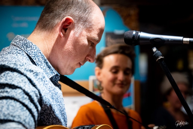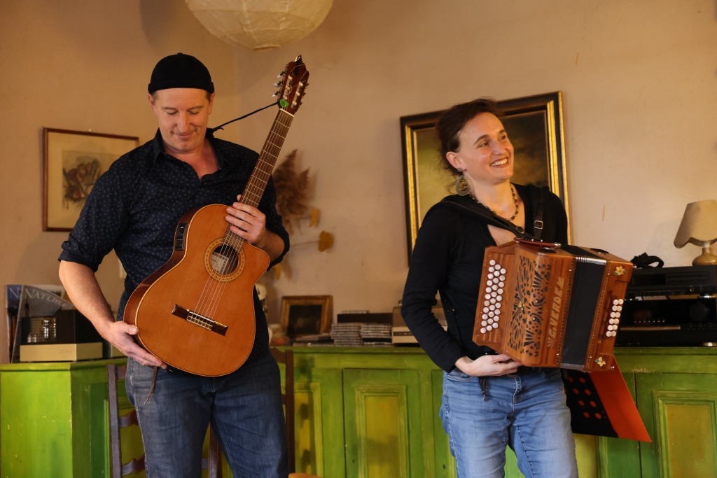 Chansons réalistes, histoires d’amour, chants de paix, chants à danser… un univers profond et poétique s’engage. Ils jouent en duo, choisissant de mêler des chants choisis parmi les grandes figures de la chanson française aux traditionnels du monde.